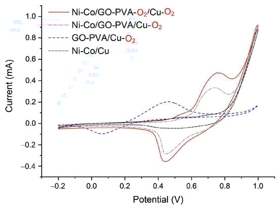 Although Ni–Co acts as a catalyst for glucose and insulin detection, GO-PVA also plays a crucial role in enhancing the sensor’s performance. As shown in Figure 5, when Ni–Co was directly electroplated onto the copper electrode and tested with 0.5 μM insulin, Ni–Co/Cu exhibited no significant anodic peak current. In contrast, the incorporation of GO-PVA significantly enhanced the sensor’s performance. Furthermore, O2 plasma treatment enhanced the adhesion of GO-PVA to the copper electrode, thereby improving Ni–Co electroplating and its catalytic activity.