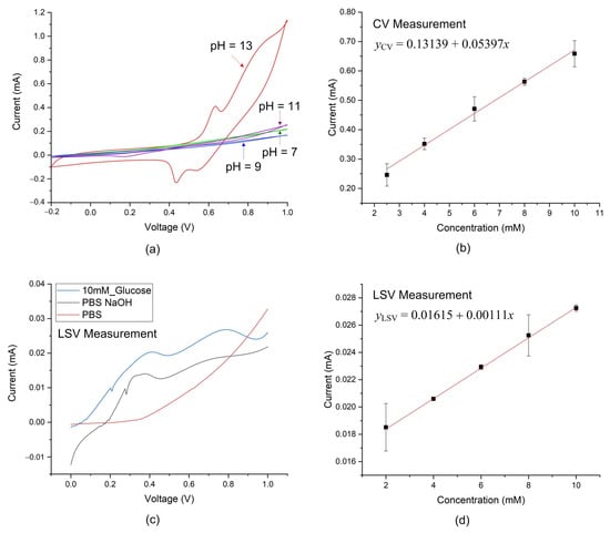 Detection of glucose: (a) The effect of pH value on redox reactions. (b) Linear relationship between the anodic peak current and glucose concentration obtained from CV measurements. (c) Current–voltage curve obtained from LSV measurements. (d) Linear relationship between the peak current and glucose concentration obtained from LSV measurements.