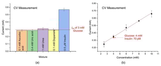 Detection of glucose with insulin: (a) Anti-interference study. (b) The anodic peak current of a mixture containing 70 pM insulin and 4 mM glucose is approximately equal to that of glucose alone.
