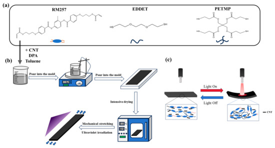 In this experiment, for the synthesis of LCEs, the molar ratio of the components was RM257: EDDET: PETMP = 55%: 42%: 3%. The preparation process is illustrated in Figure 1a,b. First, 2 g of RM257 was mixed with 0.7 g of toluene and stirred magnetically at 85 °C for 10 min to ensure complete dissolution of RM257 in the toluene. Next, CNTs were added to the mixed solution, and the mixture was stirred again for 10 min to achieve uniform dispersion of the CNTs. Subsequently, 0.474 g of EDDET, 0.098 g of PETMP, and 0.012 g of photoinitiator were added, and the mixture was stirred at 85 °C until all components were fully dissolved. Afterward, 0.288 g of DPA was added as a catalyst. Once thoroughly mixed and degassed, the solution was carefully poured into pre-prepared molds. The molds were placed in a sealed container overnight to ensure complete reaction. The mixture was then removed from the molds and placed in a vacuum drying oven at 85 °C for 12 h. After the LCE was dried, it was uniaxially stretched to 100% strain. Finally, the material was exposed to 365 nm UV light for 1 h. The resulting CNT-LCE film was used for subsequent experiments.