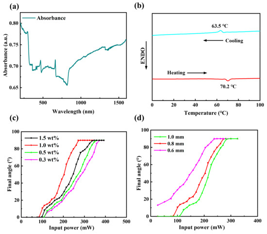 (a) UV-visible–near-infrared absorption spectrum of the CNT-LCE film. (b) Data plots of DSC measurement upon heating and cooling scans of the 1 wt% CNT-LCE. (c) Relationship between input power and the final bending angle of CNT-LCE with varying concentrations of doped CNT. (d) Relationship between input power and the final bending angle of CNT-LCE at different film thicknesses.