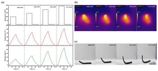 (a) Variation of temperature and bending angle of the CNT-LCE actuation layer over time under 100 mW, 144 mW, 192.6 mW, and 237.0 mW of 1545 nm near-infrared light power. (b) Infrared thermal image and (c) photograph of CNT-LCE under near-infrared light irradiation.