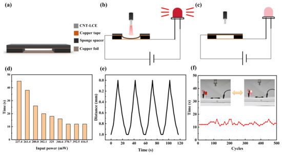To ensure that the soft optical switch achieves a sufficiently fast driving speed, we selected a 1 mm thick sponge as the spacer layer in the hollow double-layer structure. Additionally, an appropriate laser power must be chosen as the stimulus for the soft optical switch. As shown in Figure 4d, when the laser power is set at 237.4 mW, the response time of the soft optical switch is 45 s. As the laser power increases, the response time gradually decreases. When the laser power reaches or exceeds 370.7 mW, the response time stabilizes at 12 s. Therefore, we selected 370.7 mW of 1545 nm laser light as the stimulus for subsequent experiments. As illustrated in Figure 4e, when illuminated, the distance between the actuation layer and the sensing layer gradually decreases, reaching 0 mm after 12 s, at which point the diode lights up. Upon removing the light source, the distance between the two layers gradually increases, returning to 1 mm after 15 s. The repeatability of the soft optical switch is also critical. Figure 5f shows the results of 500 switching tests conducted on the soft optical switch, demonstrating that the response time consistently remains around 12 s, including excellent repeatability performance.