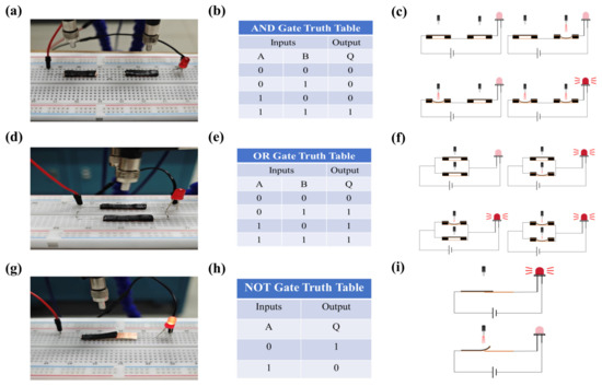 The light-controlled logic soft switch based on LCE exhibit light-responsive properties that enable shape deformation, thereby altering the state of an electrical circuit. These characteristics allow for the construction of fundamental logic gates, such as AND, OR, and NOT gates, for the execution of various digital logic operations. As illustrated in Figure 5a, two soft optical switches are connected in series to form an AND gate, connected to an LED, with the LED on/off state indicating whether the logic operation is satisfied. Figure 5b presents the truth table for the AND gate. In Figure 5c, the LED illuminates only when both switches are activated (both inputs are 1), reflecting the AND gate’s output of 1 exclusively under this condition. These illustrations confirm that the AND gate formed by the light-controlled logic soft switches based on LCE adheres to logical operations—the output is 1 only when both inputs are 1. Figure 5d depicts the configuration of two soft switches in parallel to create an OR gate, also connected to an LED. The diode’s illumination reflects the logical operation of the OR gate. The truth table for the OR gate is presented in Figure 5e. As seen in Figure 5f, the LED only remains unlit when both switches are deactivated. The LED illuminates whenever one or both switches are activated. These figures demonstrate that the OR gate, constructed from light-controlled logic soft switches based on LCE, fulfills the logical operation where the output is 1 if at least one input is 1. In the design of the NOT gate, as depicted in Figure 5g, the actuation layer and sensing layer are stacked, with the actuation layer on top and the sensing layer on the bottom. Figure 5h presents the truth table for the NOT gate. As shown in Figure 5i, when the switch is not activated, the circuit is closed, and the LED illuminates. Conversely, when the switch is activated, the circuit opens, and the LED is extinguished. This aligns with the NOT gate’s logic: the output is 1 when the input is 0, and the output is 0 when the input is 1.