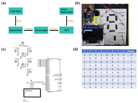 (a) Workflow diagram of the soft optical switch array. (b) Physical diagram of the soft optical switch array and microcontroller. (c) Schematic diagram of the soft optical switch array and microcontroller. (d) Encoding table for the light-signal display of the soft optical switch array.
