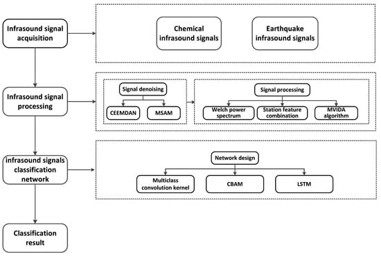 Due to the complexity of infrasound signal propagation mechanisms and the multipath nature of their transmission, received signals exhibit significant classification challenges, and a universally applicable processing and classification framework has yet to be established. To address this issue, this study proposes a novel infrasound signal classification framework based on the spatiotemporal characteristics of infrasound signals. The framework incorporates advanced signal processing techniques, signal enhancement algorithms, and deep learning architectures to achieve efficient processing and accurate classification of infrasound signals. The proposed methodological framework is illustrated in Figure 1.