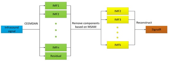 Infrasound events detected by a station are situated at a certain distance from that station. The propagation process subjects these signals to various random environmental noises, which can significantly impact their classification. Consequently, reducing noise from the original signals is a crucial aspect of data preprocessing. Given its robust performance in terms of self-adaptability and computational efficiency, the Complete Ensemble Empirical Mode Decomposition with Adaptive Noise (CEEMDAN) [] is employed in this study for the decomposition of the original signal. CEEMDAN is a decomposition method proposed based on empirical mode decomposition (EMD) []. By integrating adaptive white noise into the EMD process multiple times, CEEMDAN effectively mitigates reconstruction errors and addresses potential mode aliasing issues inherent in EMD decomposition. The specific algorithmic steps can be referenced in the literature [].