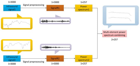 Figure 5 illustrates the combined processing workflow for infrasound signals. Initially, two infrasound signals detected by different elements of the same array are preprocessed using the noise reduction method presented in this paper. The results indicate that the processed waveforms are similar but exhibit a time lag. This discrepancy arises because both infrasound signals correspond to the same event, while the detecting elements are spatially separated. Subsequently, the power spectra of each signal are independently extracted, revealing high similarity between them. Finally, the two power spectra are combined and fed into the network as inputs from different channels. This approach not only increases redundant information but also enhances the distinctiveness of individual sample features, thereby improving the performance of feature classification.
