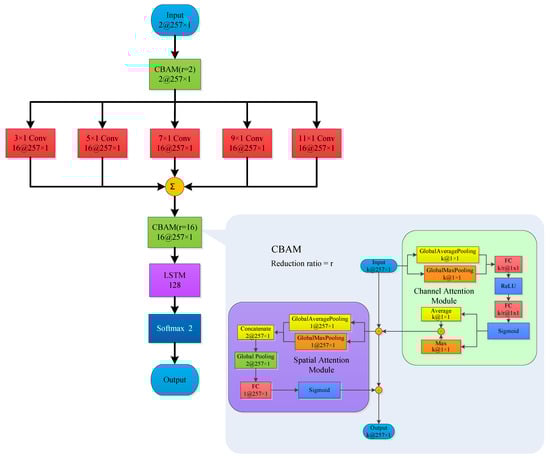 The primary objective of the initial CBAM is to acquire the characteristics of signal combination weighted in both the channel domain and spatial domain. To achieve this, five parallel convolution layers are incorporated to merge convolution features of different scales into new features, which have been found to be more effective than a single feature []. Employing CBAM once more can enhance the scale feature channels and spatial weights that are beneficial for classification tasks, while suppressing those that are not conducive to such tasks. This operation not only improves the network’s classification capability but also enhances its robustness in selecting the scale of the convolutional kernel. Additionally, LSTM is introduced to ensure that the network pays attention to both temporal and spatial characteristics, leveraging their respective strengths in processing infrasonic signals and ultimately improving classification accuracy.