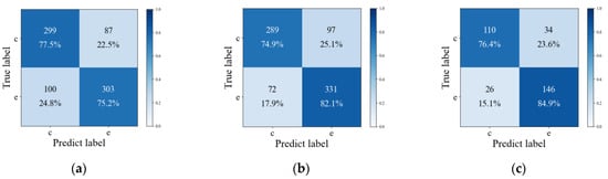 Confusion matrices of classification results for three groups of operations (c for chemical explosion, e for earthquake). (a) Confusion matrix of classification results without noise reduction and feature combination processing. (b) Confusion matrix of classification results with noise reduction but without feature combination processing. (c) Confusion matrix of classification results with both noise reduction and feature combination processing.