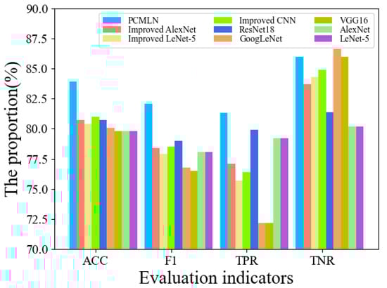 In order to further validate the classification performance and reliability of the PCMLN model, we selected five classical lightweight convolutional neural networks and three CNNs used for infrasound classification as comparators. These include LeNet-5, AlexNet, VGG16, GoogLeNet, ResNet18, improved CNN, improved LeNet-5, and improved AlexNet []. The convolution layers of classical lightweight CNNs are all within 18 layers, and CNNs suitable for infrasound classification are all improvements made on the LeNet-5 and AlexNet networks, respectively. Additionally, in order to conduct the training and testing of the data in this study, we converted all two-dimensional convolution kernels to one-dimensional ones.