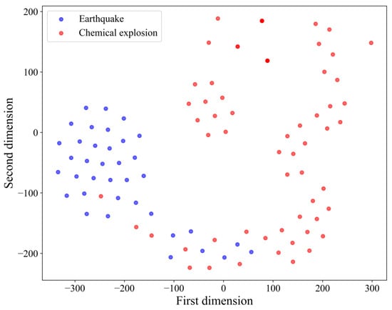 To elucidate the misclassification of infrasound samples, we applied t-distributed Stochastic Neighbor Embedding (t-SNE) to visualize the output of the classification network by reducing its dimensionality, as shown in Figure 10. The results indicate that there is a certain degree of overlap between the seismic infrasound features and the chemical explosion infrasound features extracted by the PCMLN network. Further analysis reveals that the seismic infrasound features exhibit a highly convergent distribution pattern in the low-dimensional space, characterized by small intra-class distances. In contrast, the chemical explosion infrasound features display a relatively divergent distribution with larger intra-class distances. This difference is likely due to the fact that chemical explosion data encompass multiple subcategories (e.g., missile explosions, ammunition depot explosions, and fireworks explosions). The power spectrum characteristics of infrasound signals generated by these different subcategories vary, leading to a more dispersed feature distribution. In contrast, seismic infrasound signals typically have a more consistent generation mechanism and propagation characteristics, resulting in a more concentrated feature distribution that is more readily recognized by classification models.