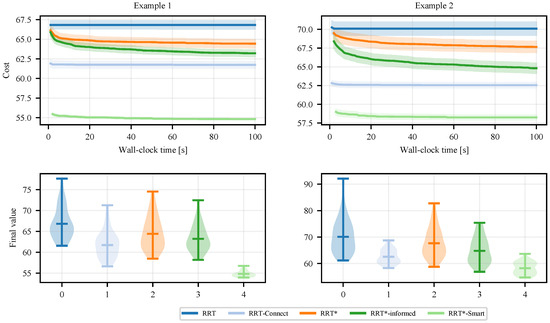 We evaluated RRT, RRT*, RRT-Connect, Informed-RRT*, and RRT*-Smart on two examples for planning the motions of rigid objects in 2D. The implementations of RRT, RRT*, RRT-Connect, RRT*-Smart, and Informed-RRT* were based on the reference code from the package https://github.com/zhm-real/PathPlanning (accessed on 10 December 2024). The hyperparameters for these methods were set as follows: , and (applied to RRT*-based methods only).