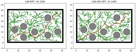 We present an experimental performance comparison between LQR-RRT* and LQR-CBF-RRT*. The LQR-RRT* and LQR-CBF-RRT* used reference implementations from the package https://github.com/mingyucai/LQR_CBF_rrtStar (accessed on 10 December 2024). The hyperparameters for these methods were set as follows: and .