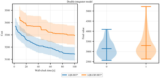 (Left) Costs are plotted against the running time showing the convergence rate of LQR-RRT* and LQR-CBF-RRT*, averaged over 50 runs. (Right) The distribution over the final costs over 50 runs.
