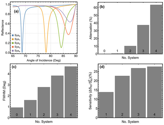 Performance analysis of the SPR biosensor configurations. (a) SPR reflectance curves for different configurations from Sys0 to Sys4. (b) Percentage of attenuation for different configurations. (c) Full width at half maximum (FWHM) for different configurations. (d) Sensitivity enhancement (%) for configurations Sys1–Sys4 compared to the reference configuration Sys0.