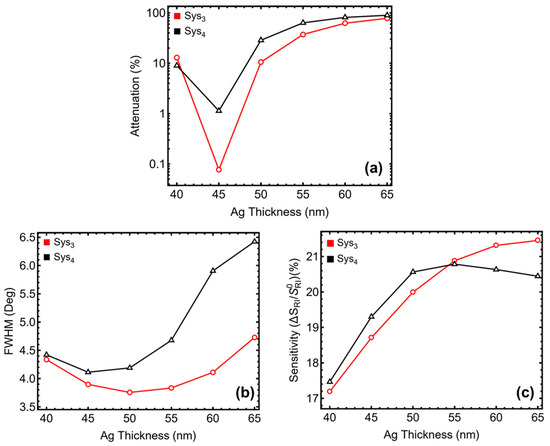 To further remark, the non-monotonic behavior of attenuation and FWHM with increasing silver thickness in Figure 2 can be explained by the trade-off between plasmonic confinement and ohmic losses. At thinner silver layers (40–45 nm), lower attenuation is observed due to reduced energy dissipation, leading to well-defined plasmonic oscillations. As the thickness increases beyond this range, the plasmonic coupling is enhanced, but excessive metal thickness results in higher radiative and ohmic losses, which broaden the resonance curve and increase attenuation. Similarly, the sensitivity enhancement in Sys4 first rises with silver thickness as stronger plasmonic fields improve refractive index detection, but beyond 55 nm, the response stabilizes due to the diminishing interaction between the evanescent field and the sensing medium. These trends align with the selection of 45 nm as the optimal thickness, ensuring a balance between sensitivity, spectral resolution, and plasmonic efficiency.