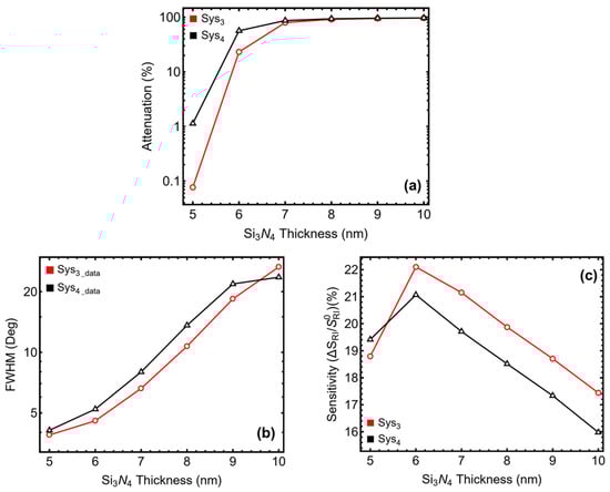 Performance analysis of Sys3 and Sys4 configurations with varying silicon nitride thicknesses from 5 to 10 nm. (a) Percentage of attenuation for each configuration, the y-axis-log scale is considered. (b) Full width at half maximum (FWHM) for each configuration. (c) Sensitivity enhancement (%) for Sys3 and Sys4, relative to the baseline systems constructed with initial parameters and optimized silver thickness value.