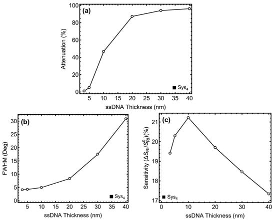 Performance analysis of Sys4 configuration with varying the ssDNA layer thickness from 3.2 nm to 50 nm. (a) Percentage of attenuation for each configuration. (b) Full width at half maximum (FWHM) for each configuration. (c) Sensitivity enhancement (%), relative to the baseline system constructed with initial parameters and optimized silver/silicon nitride/black phosphorous thickness values.