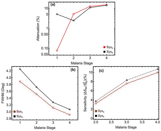 Performance analysis of optimized Sys3 and Sys4 configurations with varying the Malaria stage from Normal (I) to Schizont (IV). (a) Percentage of attenuation for each configuration, y-axis-log scale is considered. (b) Full width at half maximum (FWHM) for each configuration. (c) Sensitivity enhancement (%) for Sys3 and Sys4, relative to the optimized systems, taking as a sensing medium the Normal (I) stage.