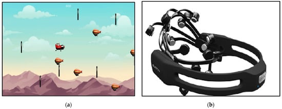 A passive BCI experiment was designed using a modified stunt plane game developed by the Glenrose Rehabilitation Hospital. The game depicts a flying plane, with obstacles in the form of striped balloons and targets in the form of black rings, as shown in Figure 1a. The plane is expected to enter or touch the black rings (targets) as much as possible and avoid the striped balloons (obstacles) as much as possible. Most of the games developed at the Glenrose Rehabilitation Hospital were tested to see which ones contain components of cognition, such as executive function, working memory, and inhibition, among others. The selection of the stunt plane game was based on a comprehensive evaluation of various games developed at Glenrose Rehabilitation Hospital for rehabilitation interventions. The stunt plane game was chosen because it was specifically designed for cognitive rehabilitation. Additionally, the game’s rules are simple and easy to under-stand, providing a straightforward, yet sufficiently challenging gameplay experience for both younger and older adults. The game is structured to engage several cognitive processes, including sustained attention (maintaining focus and adhering to the rules until the level is completed), dual-tasking (processing multiple streams of information to navigate through the rings while simultaneously avoiding the obstacles), and processing speed (rapidly interpreting visual stimuli and executing precise motor actions to control the plane). Despite the game’s potential of as a cognitive rehabilitation tool, its effectiveness has not yet been systematically tested. Before evaluating the effectiveness of video or computer game-based interventions on the cognitive function, it is essential to assess how engaging these games are for the target population. Engagement is a critical factor in the success of such interventions, as it influences motivation, adherence, and the overall outcomes. Therefore, this study focuses on exploring the engagement elicited by the stunt plane game in adults and older adults, measured via both subjective and objective engagement metrics.