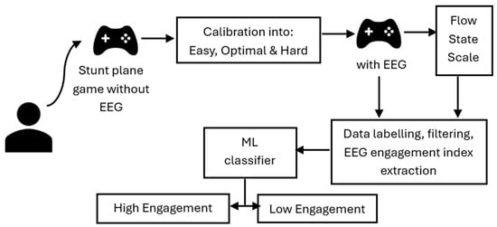 After an explanation of how to play the game, a written informed consent was obtained from each participant before starting the game. In the first phase, the participant played the game from level 1 to 10 without the EEG headset, and the data obtained were used to calculate the easy, optimal, and hard levels for each participant (see Figure 4). The easy level was level 1 for all of the participants, while the hard level was 4 levels above the calculated optimal level. The participant then played the game again (only at the previously determined easy, optimal, and hard levels) with the EEG headset on for 2 min, resting for 5 min between each gameplay session, and filling out the flow state scale of occupational tasks within that time []. This allowed the effect of the previous gameplay session to wash out before the next one began. The reported engagement score and the EEG data were then processed and the rated engagement score from the flow scale was used to label the processed EEG data, which were then fed to the machine learning classifier to be classified into “High” or “Low” engagement.