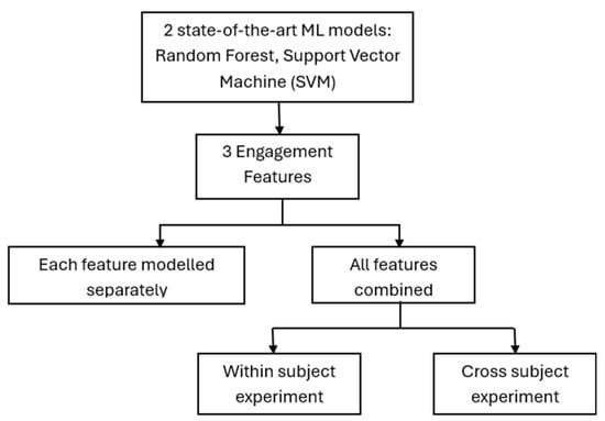 EEG and other automatic engagement analyses have employed ML extensively in the area of human–computer interactions for task classification, learning concentration classification, and workload and engagement classification [,,,,,,]. The adoption of ML in these studies is due to its capacity to handle large, complex, and high-dimensional data, and to synthesise insights from them. The learning process is computational, which makes ML worthwhile in automatic systems.