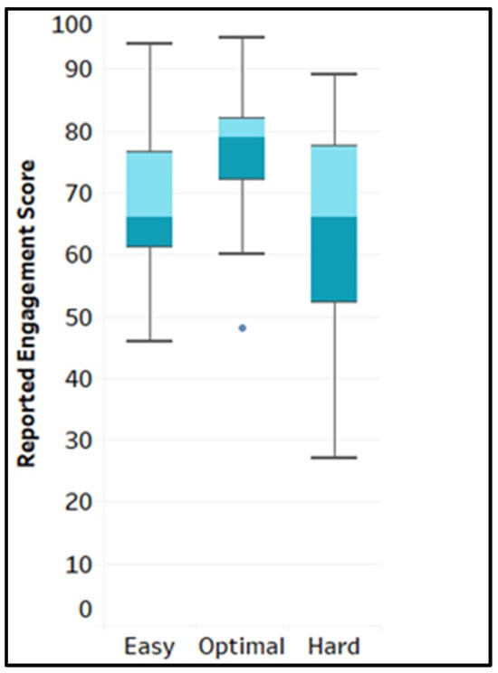 Engagement is a state of concentration, immersion, or absorption in a task cognitively, behaviourally, and emotionally [,,]. Engagement is often associated with losing a sense of time awareness due to a high immersion and interest in the task at hand. Engagement can be positive when the person feels absorbed and wants to continue performing the activity (as the effort matches the task), but it can also be negative when the person feels bored due to the challenge being too small, or frustrated because the challenge is too much to match their skills which causes them to want to discontinue playing [].
