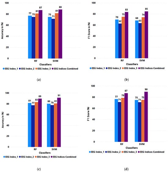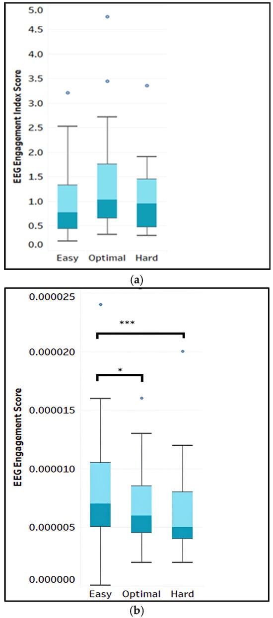 The acquired EEG data were sampled at 128 Hz and collected for 2 min. EEG data are very noisy and often contaminated by artefacts such as baseline wander (0–0.5 Hz), powerline noise (50/60 Hz), electromyography noise (high-frequency noise: 20–500 Hz), and electrode/body movement noise []. No data interpolation was needed as there was no data loss, and a simple preprocessing pipeline was adopted. During the data collection, the impedance of the electrodes was checked (proper contact of the electrode with the scalp was ensured) and the signal quality index in EmotivPRO live streaming was ensured to be between 90 and 100% before starting data collection. Hence, after collecting the EEG signal, it was denoised using a fourth-order Butterworth band pass filter (0.5 Hz–45 Hz) as implemented in []. The band pass filter helped to suppress the high-frequency muscle noise of the scalp and the slow drift (and possible ECG) artefact, which are characterised by a low frequency []. The 60 Hz powerline noise (North America standard) has also been eliminated as the upper cut-off frequency of the band pass filter was 45 Hz. The infomax method of independent component analysis (ICA) from the MNE Python library (version 1.5.1-https://mne.tools/1.5/auto_examples/preprocessing/muscle_ica.html, accessed on 12 November 2024) was used to automatically further remove the muscle artefact components. The automatically excluded components were also manually inspected before removal. The analysis was performed in Python environment version 3.11.3. Because of the unavailability of dedicated recording channels for EOG, EMG, and ECG in emotive EPOCX, the commonly employed state-of-the-art methods in the research by Urigüen and Garcia–Zapirain [] for eye blinks, muscle, and heartbeat removal were not implemented in detail. EEG data were segmented into a one-second non-overlapping window, as implemented in []. The rated score of high or low was used to label the segmented EEG data. The self-reported engagement score for the 2 min of playing the game was rated either as high (if the score was ≥4.5 points) or low (if the score was <4.5), as adapted from the flow state scale of occupational tasks. Each segment contains 128 EEG data points. The absolute power of the wave bands was calculated using the multitaper method of power spectral density. The typical features of engagement called engagement indices found in the literature were β/(θ + α), β/α, and 1/α, where Theta [θ: 4 Hz–8 Hz], Alpha [α: 8 Hz–13 Hz], and Beta [β: 13 Hz–30 Hz]. These three EEG wave bands are particularly important, as an increase in the beta wave band power has been linked to an increased brain activity when performing a mental task, while low mental activities were highly correlated with high alpha and theta power [,]. EEG engagement indices are the EEG-based metrics used to assess the engagement level []. The EEG engagement index 1 (β/(θ + α)) was first proposed by Pope et al. [] at NASA, while index 2 (β/α) and index 3 (1/α) cannot be linked to anybody in particular, but they have been used in the literature to examine mental engagement and attention [,,]. For these engagement indices, the power of these frequency bands was calculated using power spectral density, and the average band power over the one-second-long EEG data were calculated for each of the 120 segments that made up the 2 min of gameplay. This was repeated for all three engagement indices, 14 channels, and each difficulty level.