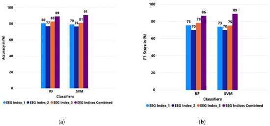 More recent papers such as Amprimo et al. [] used a mixture of eye blinks and EEG features to determine the engagement during video gameplay. The study employed an engagement index (β/(θ + α)), besides a concentration index and Event-Related Desynchronisation and Event-Related Synchronisation (ERD/ERS) as engagement features. ERD is linked to engagement and active mental processing, a decreased power in the alpha and beta band, and an increased cortical activity, while ERS is linked to disengagement or a more relaxed brain state, an increase in power in a frequency band, and a reduced cortical activity. Four different models were developed, and discriminant analysis (DA) offered the best performance, at a 98.6% accuracy when classifying the resting and active engagement in the game. The work of Apicella et al. [] sought to automatically determine student engagement in a learning environment using EEG with an experimental setup that involves a continuous performance test, background music, and social feedback. It adopts the cognitive and emotional components of engagement. They compared the performance of five different strategies, including traditional engagement index (β/(θ + α)), Butterworth–Principal Component Analysis (BPCA), filter bank, domain-adaptation, and Butterworth–Common spatial pattern (BCSP) along with several ML algorithms. SVM offers best result at approximately 77% accuracy, alongside filter bank and common spatial pattern. Natalizio et al. [] also used a filter bank and engagement index (β/(θ + α)) with a linear discriminant analysis for the real-time engagement estimation using a d2 test, video, and a Tetris game. The models achieved a classification accuracy of 90% for the filter bank and 81% for the engagement index, on average, when tested on an independent d2 test paradigm recording (resting state against engagement state).