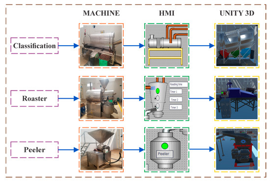 The development of the active learning tool required the development of an interactive work environment that faithfully reproduced the operations of a real industrial plant; the work environment must consider, in detail, the operating characteristics of the equipment and instruments, as well as the dimensions and properties of the physical environment in which the process takes place. This includes the structure of the grading, roasting, and peeling machines, as well as the associated transport systems. It also considers the operational indicators of actuators and sensors of the process, which allow providing real-time feedback on the state of the system, facilitating informed and timely decision-making.