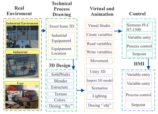 A key feature of Digital Twin-based learning is the simulation of actuators, transducers, and other components of an industrial plant. Students are responsible for controlling process variables, such as temperature, pressure, or flow rate, and observing how these changes affect the overall system. In the event that a mistake is made during the execution of tasks, the system can signal faults such as fires, machinery failures, or safety issues, which generates immediate feedback and encourages a problem-solving approach [19,20]. This approach not only reinforces theoretical learning but also develops critical practical skills, such as decision-making under pressure, analyzing real-time data, and understanding the relationship between control actions and system responses. The ability to integrate simulated failures in a controlled environment provides students with an experience close to industrial reality, preparing them more effectively for the challenges they will face in their future careers. The implementation of Digital Twins in active learning environments is based on a crucial step: the complete virtualization of the industrial process [21,22]. This involves recreating key physical aspects of the work environment, such as dimensions, textures, and industry-specific operating conditions. To carry out this process effectively, advanced tools can be used such as Unity 3D (Unity Technologies, San Francisco, CA, USA), a software tool that stands out for its ability to accurately represent an industrial environment in detail [10]. Unity 3D allows the creation of interactive virtual environments in which safety standards are incorporated, realistic interaction with machinery is simulated, and avatars wearing the appropriate personal protective equipment (PPE) are used, significantly improving the immersion and realism of the simulation.