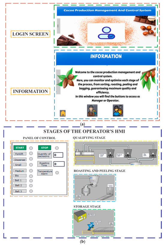 Figure 4 shows the HMI configuration. The system started with the design of several screens, each oriented to meet the specific needs of the users involved. The first screen focused on user access management, ensuring an adequate level of security and control. The second screen provided general system information, offering a clear and detailed overview of the operating parameters. And finally, the system operation screen provided information and privileges according to the type of user who accessed the system. That is, if the access was with a manager password, detailed information of the cocoa treatment process was presented in a read-only format, guaranteeing the integrity of the data by allowing the editing of entries. While if logged in as an operator, the interface offered essential interactive elements, such as start and stop buttons, settings to set the start-up time of the grading machine motor, and options to select the number of bags of cocoa to be produced according to size. This integration ensured a balance between strategic oversight and operational control, promoting both process efficiency and an active learning experience for users.
