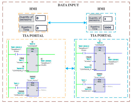 The experimental setup was conducted in an industrial automation lab, where 16 eighth-semester mechatronics students programmed and parameterized a PLC using TIA Portal V17. The students integrated sensor and actuator signals, allowing real-time visualization of the system responses within a virtual environment developed in Unity. The interaction between the PLC, the Digital Twin, and the HMI (WinCC) was essential to ensure a bidirectional exchange of data and commands. Figure 6 illustrates a critical aspect of system operation, showing the transition from initial user input to real-time updates within the HMI and PLC logic. The left section of the diagram represents the initial state, in which no user-defined parameters have been entered, while the right section shows the updated system response following data entry. Specifically, the Packaging Quantity and Roasting Time parameters were modified through the HMI, which caused a real-time update within the PLC logic, as shown in TIA Portal V17.
