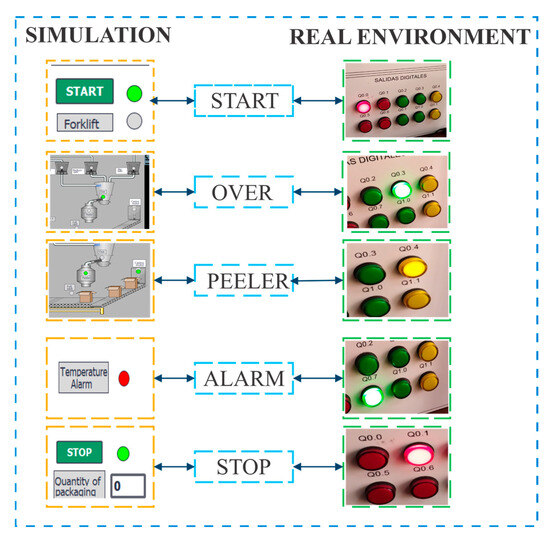 During the test, five key events in the automated process were analyzed: system activation (START), operation status (OVER), peeler operation (PEELER), activation of a temperature alarm (ALARM), and process termination (STOP). It was verified that each command entered in the HMI generated an immediate and consistent response in the physical system, observing the corresponding activation in the PLC digital output modules. The results showed minimal discrepancies in response times, confirming that the synchronization between HMI inputs and PLC logic updates remained within an acceptable range. This behavior demonstrates the robustness and fidelity of the system integration, ensuring that the Digital Twin highly accurately reflects the actual process operating conditions.