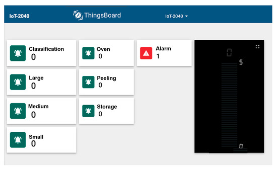 In addition to the HMI-based interaction, the system includes a real-time visualization application implemented on the ThingsBoard platform. This application provides an interactive dashboard that displays critical process stages, including classification, roasting, and peeling, as well as the type of cocoa bean being processed. The visualization system was fully synchronized with the developed Digital Twin, offering real-time monitoring of process variables. Moreover, if the temperature deviated from optimal conditions, the system triggered an alarm notification, alerting the user and enabling prompt corrective action. This additional layer of interaction significantly enhanced the situational awareness of users, facilitating real-time decision-making and improving process control efficiency (see Figure 8).