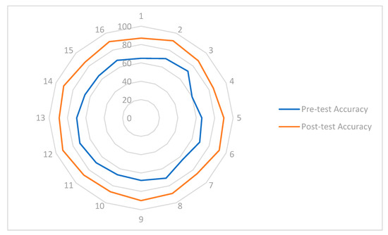 The comparison of system manipulation accuracy between the pre-test and post-test was analyzed, as shown in Figure 12. This analysis highlights the positive impact of Digital Twin technology on the active learning process. It was observed that accuracy in the manipulation and control of the cocoa production system using Digital Twin technology was significantly higher compared to the traditional methodology. In the pre-test, where students worked exclusively with conventional teaching modules, the average accuracy was approximately 67.63%, revealing certain difficulties in programming and system configuration. In contrast, following the intervention with the Digital Twin and the completion of the post-test, the average accuracy increased to 88.81%, reflecting a 21.18% improvement in students’ ability to understand and operate the system.
