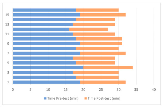 Figure 13 presents a comparison of the time students took to manipulate the system using the traditional method versus the active learning tool based on Digital Twins. A significant reduction in the time required to complete tasks was observed following the intervention with the Digital Twin. During the pre-test, where students worked with conventional teaching modules, the average time to program and control the system was approximately 18 min. In contrast, in the post-test, where students interacted with the Digital Twin, the average time was reduced to 12 min, representing a 6 min decrease in execution time.