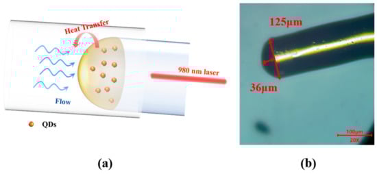 As shown in Figure 1a, the proposed flowmeter is a Fabry-Perot Interferometer (FPI) composed of two layers of gold films fabricated on the surfaces of single mode fiber (SMF, Yangtze Optical Fibre and Cable Joint Stock Limited Company, Wuhan, China) and the outer surface of cavity formed from a composite material of PbS QDs doped in UV-curable adhesive (Norland Optical Adhesive 61, Norland Products, Jamesburg, NJ, USA). Figure 1b, obtained by using an optical microscope (107JX, Shanghai Puda Optical Instrument CO, Shanghai, China) under 20× objective magnification, presents an optical microscopic image of the sensor, which has a cavity length of approximately 36 μm. Due to the size dependent bandgap of QDs, the pump light at 980 ± 8 nm is partially absorbed and converted into thermal energy, leading to an increase in the cavity temperature. For light with energy smaller than the bandgap of the QDs, the QD-doped adhesive acts as a non-absorptive medium, allowing strong interference between the two reflective gold mirrors. The interference wavelength can be expressed as follows []: