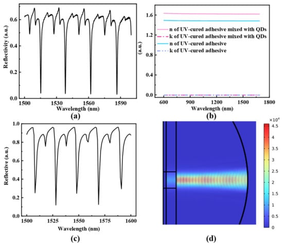 The experimental inference spectrum of the prepared optical fiber sensor is shown in Figure 2a. The refractive index of the UV-cured adhesive, both before and after mixing with PbS QDs (10 mg/mL), is characterized using an ellipsometer, and the results are presented in Figure 2b. Based on the measured refractive index of the composite material and the captured profile of the concave mirror (Figure 1b), we utilized Finite Element Analysis software (COMSOL Multiphysics 5.3) and the theory of light transmission in a medium and optical interference to construct a simulation model. The simulated reflection spectrum of the sensor is shown in Figure 2c. The FSR of the plano-concave cavity can be calculated using Equation (2), yielding an approximate value of 22 nm, which is consistent with the simulation results. The electric field diagram at the resonant peak of 1569 nm, depicted in Figure 2d, confirms the strong interference within the optical cavity.