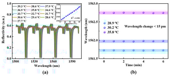Before applying the proposed sensor to flow velocity detection, it is necessary to characterize its spectral response to temperature variations. The reflection spectrum is collected by placing the sensor in a temperature-controlled chamber, with the temperature range set to increase from 27.7 °C to 39.3 °C in approximately 1 °C increments. The spectral response of the optical fiber sensor to temperature changes is shown in Figure 3, demonstrating that the spectrum redshifts as the temperature increases. The temperature sensitivity, obtained through fitting, is 253 pm/°C, with a linearity of 0.998. Furthermore, the time-dependent optical response of the sensor at a fixed temperature is examined to verify its stability in temperature sensing. As illustrated in Figure 3b, three distinct temperatures are chosen for a 6 min stability test, with data recorded at 1 min intervals. These results confirm that the optical fiber probe exhibits favorable temperature stability.