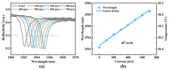 (a) Spectral response of the sensor probe under excitation of pump laser with different driven current, and (b) the fitting between spectral shift and driven current.