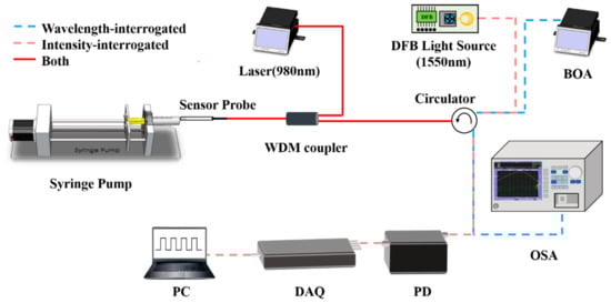 To explore the sensor’s ability to detect flow velocity in liquid, optical systems based on both wavelength demodulation and intensity demodulation are constructed, as shown in Figure 5. The wavelength demodulation system consists of an optical fiber probe, a 980 nm pump laser (LUMENTUM, S27-7602-460, San Jose, CA, USA), a broadband light source (Booster Optical Amplifier, BOA, Thorlabs CLD1015, Newton, NJ, USA), an optical spectral analyzer (OSA, Yokogawa AQ6370C 600 nm–1700 nm, Houston, TX, USA), and a precision injection pump for the liquid. The broadband light source and the spectral analyzer are connected via a circulator, and a wavelength division multiplexer (WDM, 980 nm and 1550 nm) is used to transmit both the pump laser and the broadband light, facilitating effective wavelength demodulation. For the intensity demodulation setup, a 1550 nm Distributed Feedback Laser (DFB, Santur TL-2020-C-102A, Fremont, CA, USA) serves as the light source. Additionally, a photodetector (PD, Beijing Conquer Photonics KG-PR-500M, Beijing, China), a high-speed data acquisition card (DAQ, NI Cdaq-9171, Austin, TX, USA), and a personal computer (PC) are used for data acquisition and processing. During the flow velocity sensing experiment, the optical fiber probe is securely placed in a microfluidic channel. The microfluidic channel consists of a transparent rubber tube with a constant inner diameter of 2 mm, externally connected to a syringe for fluid flow. To prevent sensor displacement due to liquid buoyancy or flow, a support bracket and adhesive tape secure the sensor at the channel’s center. The liquid flow velocity is precisely controlled by a syringe pump with an electrical motor. We made a simple adiabatic environment using heat insulation materials to prevent the influence of external temperature changes on the experiment.
