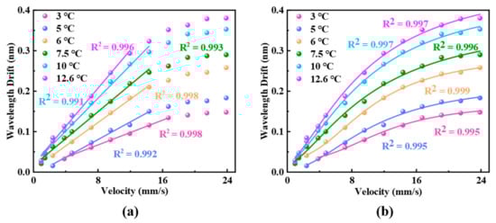 Experimental results of spectral drift corresponding with the variation in flow velocity. (a) Results of linear fitting and (b) the fitting results based on Equation (7).