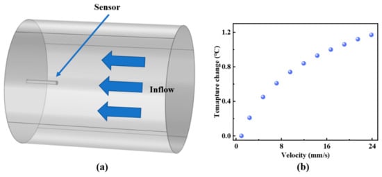 (a) Simulation model of flow velocity sensing. (b) Simulation results of sensor temperature variation with flow velocity.