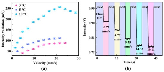 Given that spectrometers are typically expensive and not suitable for integrated testing, this study also employed the intensity demodulation method. This method replaces the wideband light source and OSA with a DFB laser and photodetector, respectively, offering a cost-effective and easily integrated testing system. The variations in the average electrical intensity collected from the photodetector, under different initial temperatures, are documented within the flow velocity range of 0.96 mm/s to 23.88 mm/s. The experimental results based on the intensity demodulation scheme are presented in Figure 8a, where a general linear relationship is observed at relatively low flow velocities. By converting optical signal variations into electrical signals using a photodetector, demodulation is achieved. The data in Figure 8a represent the average values from multiple repeated experiments, corresponding to different flow velocities. By subtracting the electrical signal intensity at zero flow velocity, the final data in Figure 8a are obtained. For the demodulation result at a 10 °C temperature increase, the signal intensity initially increases then decreases as the flow velocity increases, which can be explained by the sensor’s working point. The working point is defined as the optimal wavelength of the demodulation light source that ensures the sensor’s measurement range and linear region. In this study, the working point is selected to be at a position on the descending edge of the reflection spectrum close to the interference peak. As the flow velocity increases, the working point moves out of the linear sensing range. Figure 8b shows the dynamic response of the electrical signal under different flow velocities with an initial temperature increase of 10 °C. In the absence of liquid flow, the electrical signal remains stable. However, when liquid flow is present, the electrical intensity shifts rapidly and stabilizes at a value corresponding to the flow velocity, confirming the feasibility of the intensity demodulation method. Although intensity demodulation is cost-effective and convenient, it still requires the determination of the operating point for each measurement. A proper strategy of swiftly determining the working point of the sensor would be necessary to improve the efficiency in the future.