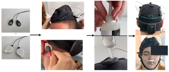 The image sequence shows the steps involved in setting up the EEG system: first, the ground and reference electrodes are shown. Next, the EEG cap is positioned on the head, followed by the attachment of the reference electrodes behind the ears. Conductive gel is applied to ensure proper contact, and the positioning of the electrodes is checked to ensure they are in the correct locations and maintain good contact with the scalp according to the 10–20 standard.