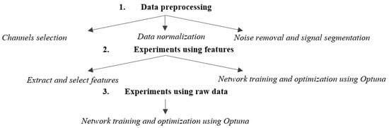 The workflow consists of three main stages: data preprocessing, training/validation using extracted features, and training/validation using raw data. Both the feature-based method and the raw EEG data method include an automatic hyperparameter search step for optimizing the networks. The preprocessing stage, critical for ensuring data quality and consistency across datasets, involves three steps for both approaches. The first step is selecting common channels to ensure that the same cortical regions are analyzed across the two databases and a consistent input format is used. Next, the data are normalized to bring them to the same unit of measurement, and the final preprocessing step involves noise removal and signal segmentation to standardize the data length.