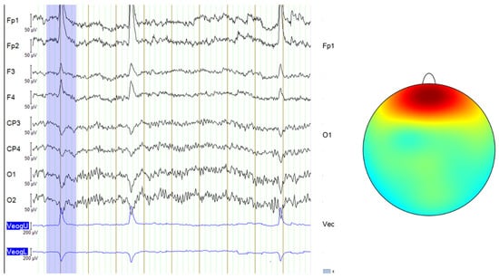 Blink artifacts in EEG data, with the last two channels representing an EOG signal that records eye movements (left) and the topographic map showing the typical scalp distribution of blinks (right—color gradients represent electrical activity across the scalp and red indicates high positive voltage, concentrated around the frontal electrodes) [10].