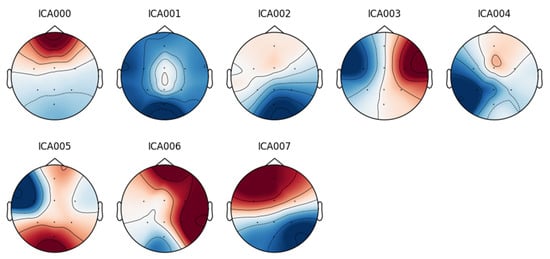 An eight-component representation was chosen, from which the component labeled “ICA000” was identified as corresponding to the blinking artifacts. This component was removed, and the signal was then reconstructed.